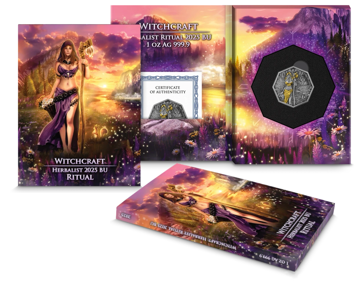 Witchcraft: Herbalist Ritual 1 oz Silver 2025 is the second heroine of the exceptional Witchcraft series. The coin continues the collection depicting extraordinary women from Germanic mythology, endowed with secret knowledge and power. The Herbalist was a guardian of the ancient secrets of nature—she could recognize the properties of every plant and create healing potions and infusions of magical strength.