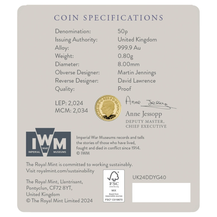 La moneda está acuñada en lingotes de oro puro Au.9999, con un peso de 1/40 de onza troy y 8 mm de diámetro, en estándar proof. La acuñación de la moneda es de 2024 piezas. Además, esta extraordinaria pieza ha sido producida por The Royal Mint. Se conserva en su embalaje original. La moneda está garantizada por el gobierno del Reino Unido en cuanto a su legalidad, pureza del lingote y origen del metal, y tiene plena curso legal en el país del emisor.