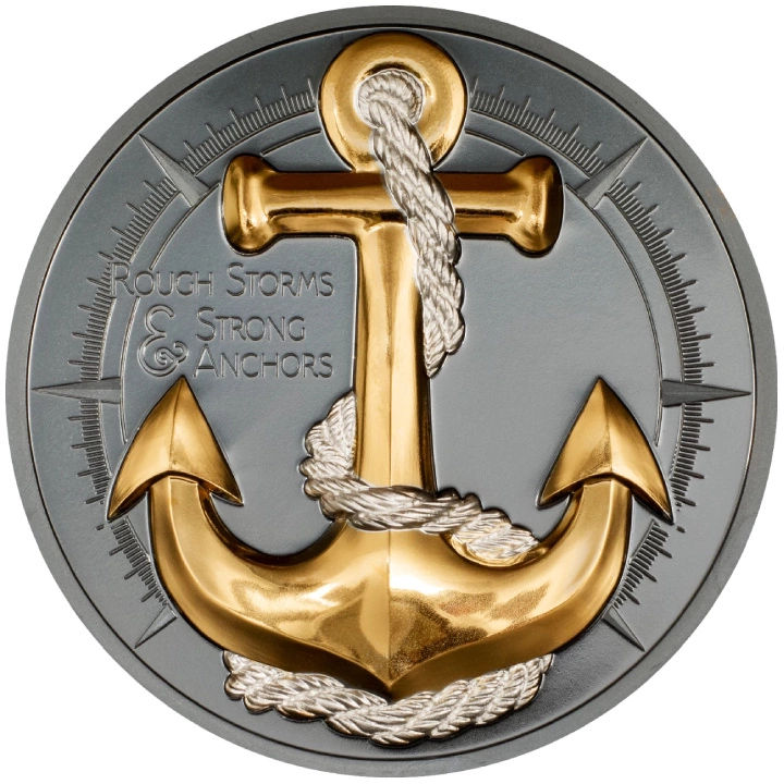 Reverso muestra un ancla dorada. En el reverso también se encuentran las inscripciones "ROUGH STORMS" y "STRONG ANCHOR."