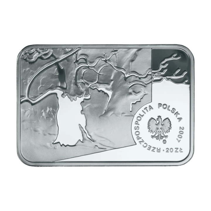 El anverso presenta el escudo de armas de la República de Polonia – el águila coronada – junto con la inscripción “RZECZPOSPOLITA POLSKA 2007” y el valor facial “20 ZŁ”. Al fondo se observa una composición estilizada con elementos gráficos del propio Wyczółkowski, lo que confiere a la moneda un carácter artístico y hace alusión directa a su técnica.
