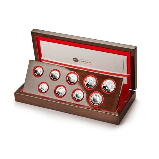 100 años del zloty polaco - serie de monedas de plata NBP El 28 de febrero de 1919 se aprobó una ley que sustituyó el marco polaco por el zloty polaco. El zloty polaco se introdujo varios años después sobre la base de la reforma monetaria de Władysław Grabski de 1924. Conjunto de nueve monedas cuyas imágenes reflejan las monedas polacas en circulación. 1 penique - Ø 15,5 mm; 3,94 g 2 peniques - Ø 17,5 mm; 5,1 g 5 grosze - Ø 19,48 mm; 6,24 g 10 grosze - Ø 16,5 mm; 4,51 g 20 grosze - Ø 18,5 mm; 5,49 g 50 grosze - Ø 20,50 mm; 6,71 g 1 zloty - Ø 23 mm; 8,17 g 2 zloty - Ø 21,50 mm; 7,23 g 5 zloty - Ø 24 mm; 9,43 g. Todo el juego, junto con un certificado de autenticidad, se presenta en un elegante estuche.