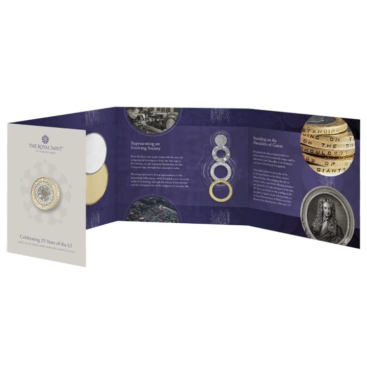 El reverso muestra la emblemática moneda de 2 libras esterlinas conocida como "Tecnología" y las inscripciones "TWO POUNDS", "25" y "1997". Bruce Rushin es el responsable del diseño del reverso.