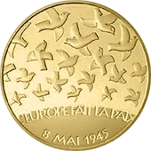 Revés: está decorado con la imagen de una bandada de palomas y las inscripciones "Europa contiene la paz" y "8 de mayo de 1945".