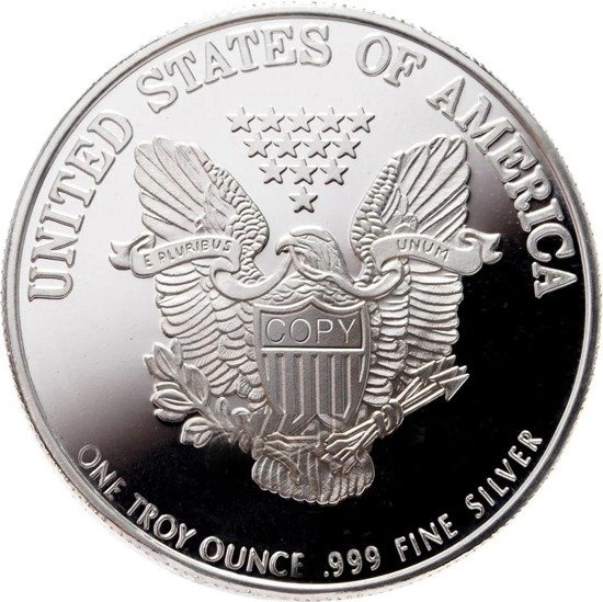 Rewers jest zdobiony przez orła, narodowy symbol Ameryki. Nad głową orła znajduje się trójkąt stworzony z 13 gwiazd. Wokół rantu widnieje napis "United States of America. One troy ounce .999 Fine Silver. Na wizerunku orła znajduje się napis COPY.