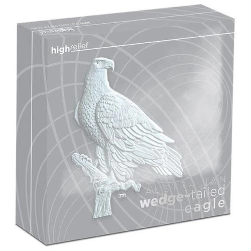Águila australiana (águila de cola en cuña) 5 onzas de plata "El águila australiana (Aquila audax) es una especie de ave de gran tamaño de la familia de los halcones (Accipitridae). Es el ave rapaz más grande de Australia y la más numerosa de las grandes especies de águilas. Apariencia externa: el ave tiene alas largas y bastante anchas, espinillas emplumadas, una articulación del corvejón y parte de la pata-salta, así como una cola y unas alas características con la punta en forma de cuña. Debido a su gran envergadura, esta especie es una de las más grandes del orden de las rapaces. El águila australiana es una de las doce especies del género Aquila cuya coloración es predominantemente oscura. Tamaños: Longitud - De 0,9 a 1,15 m. Envergadura - De 1,8 a 2,5 m. Masa corporal: De media, entre 3,2 y 4,2 kg. A veces hasta 5,5 kg. Entorno Habitan casi todos los hábitats, aunque tienden a inclinarse por los bosques. Abren colonias en el sur y el este de Australia. Área de distribución Las águilas australianas se encuentran en toda Australia, incluida Tasmania y el sur de Nueva Guinea". La moneda fue diseñada por el artista estadounidense John M. Mercanti, que también diseñó la imagen del Águila Americana de Plata y ha producido más monedas y medallas que cualquier otro diseñador empleado por la Casa de la Moneda de EE. S. Mint