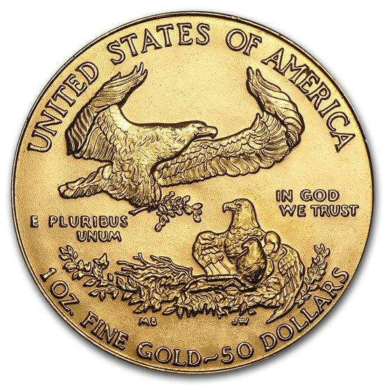 En el reverso del Águila Americana, vemos la imagen de un pájaro posándose en un nido, diseñada por la escultora estadounidense Miley Tucker-Frost. En el reverso también figura la máxima estadounidense de la Declaración de Independencia: "In God We Trust" (En Dios confiamos) y “E pluribus unum” (De muchos uno).