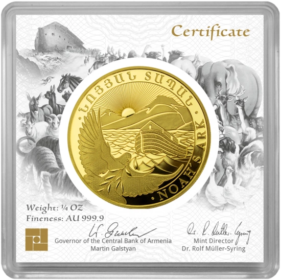 El anverso de la moneda, diseñada por Eduard Kurghinyan, representa el arca sobre un mar embravecido, con el monte Ararat de fondo y el sol naciente. El monte debe su nombre a Ara, un ídolo de la Edad de Bronce. Ara era el dios de la muerte y el renacimiento. En el centro de la moneda aparece una paloma volando sobre las aguas del Diluvio, con una rama de olivo en el pico. En el canto figura la inscripción "Arca de Noé", en inglés.