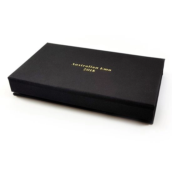 Las monedas se venden como un juego, empaquetadas en una elegante caja con la inscripción dorada "Australian Emu 2018".