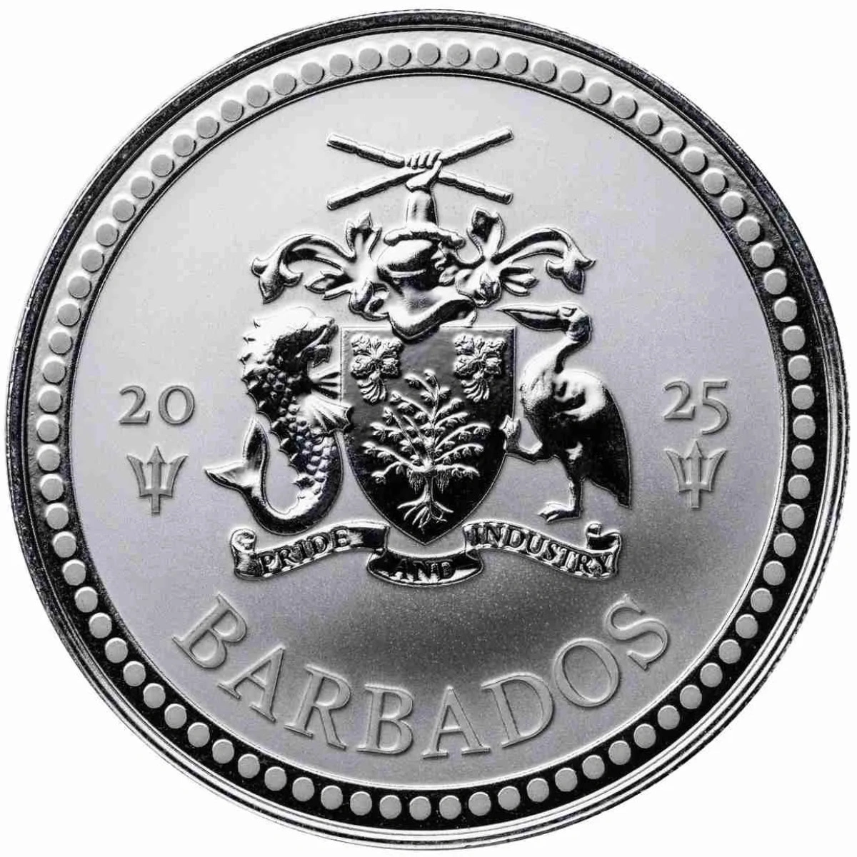 El anverso muestra el símbolo nacional de Barbados – el tridente – junto con el valor facial, el peso de una onza y la pureza de la plata, destacando el carácter de inversión de la moneda.
