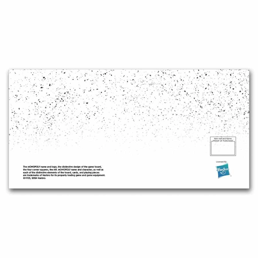 Reverso: Muestra la denominación "$500" del dinero de juguete utilizado en el juego Monopoly. En el reverso también se ve una imagen de una locomotora de tren en una esquina y uno de los hoteles en la otra esquina.