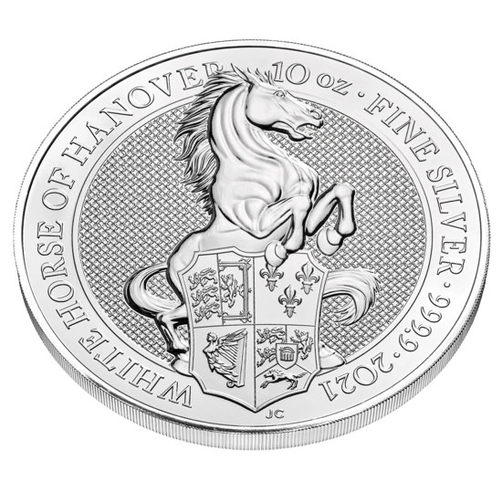 La moneda en lingotes del Caballo Blanco de Hannover es un producto de diez onzas troy y prueba de plata 9999 y está acuñada por la renombrada The Royal Mint. Al igual que las demás monedas de la serie, esta moneda está garantizada por el Gobierno británico y tiene curso legal en el Reino Unido. .