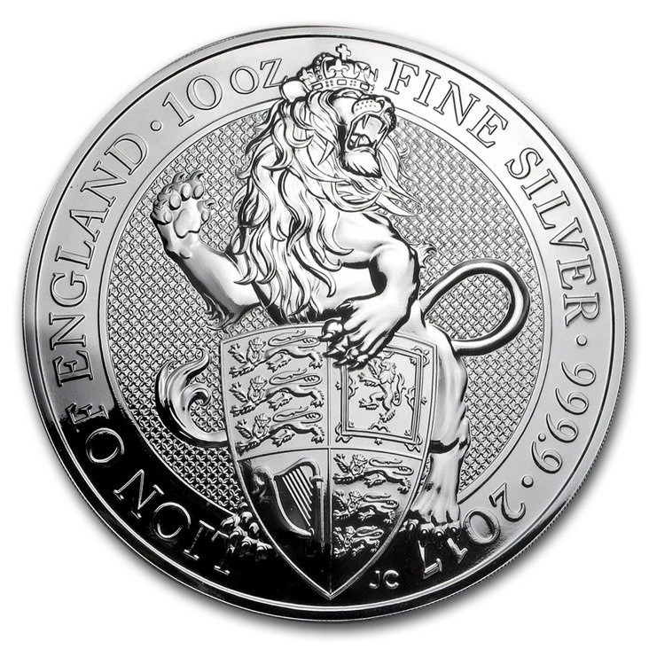 Revés: representa una imagen estilizada de un león inglés que sostiene el escudo de la Familia Real , así como información sobre el peso (10 oz), la pureza (0,9999 Ag) y el año de acuñación (2017).