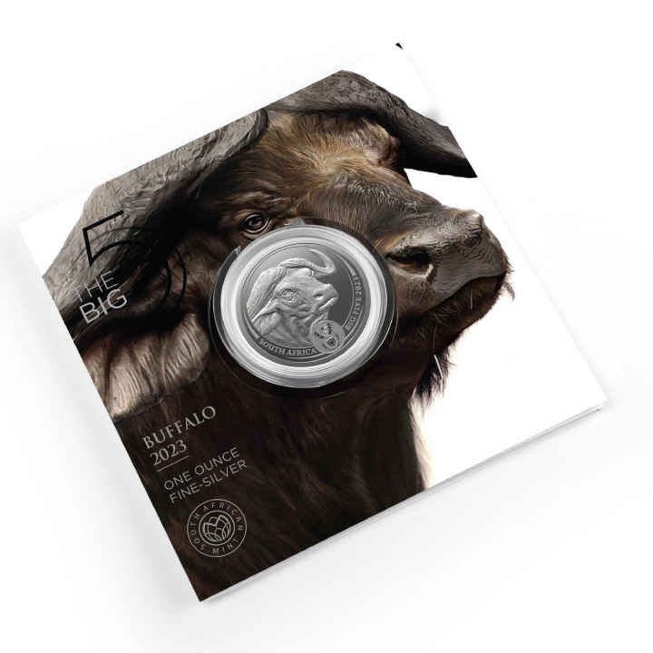 La moneda Big Five II: Buffalo 1 Ounce Silver 2023 es la quinta entrega de la segunda serie, la Big Five II. La primera serie fue muy popular entre coleccionistas y compradores. La serie de edición limitada Big Five Africa está compuesta por animales: elefante, león, rinoceronte, leopardo y búfalo. La moneda muestra el búfalo. Los animales son principalmente herbívoros.La moneda de plata en lingotes fue acuñada a partir de lingotes de Ag.999 puro, pesa 1 onza troy y mide 38,73 mm de diámetro.