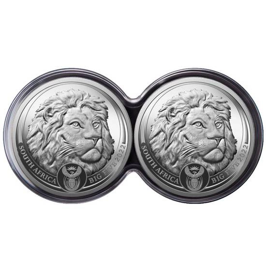 El producto Big Five II: Lion Set 2 x 1 Ounce Silver 2022 Proof es un juego que contiene monedas que son la segunda entrega de la segunda serie, la Big Five II. La primera serie fue muy popular entre coleccionistas y compradores. La serie Big Five Africa, de edición limitada, está compuesta por los animales elefante, león, búfalo, rinoceronte y leopardo. La moneda representa al león africano, considerado el rey de todos los animales africanos. Las monedas han sido acuñadas en lingotes de Ag.999 puro, pesan 1 onza troy y miden 38,73 mm de diámetro, según el estándar proof.