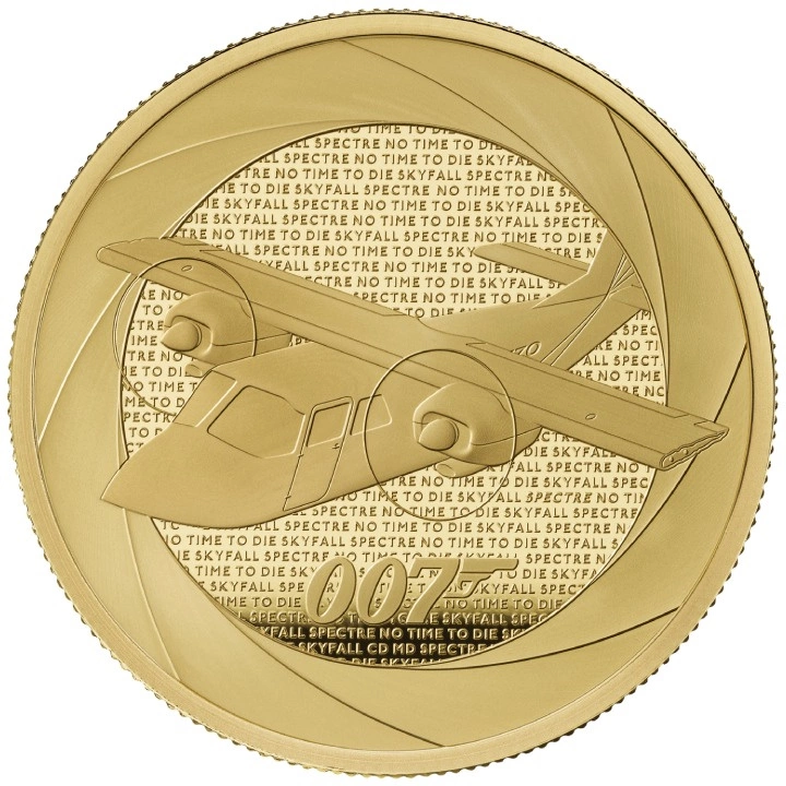 El reverso de la moneda muestra el avión de la película Spectre y el logotipo de 007, con el reverso diseñado por Matt Dent y Christian Davies.