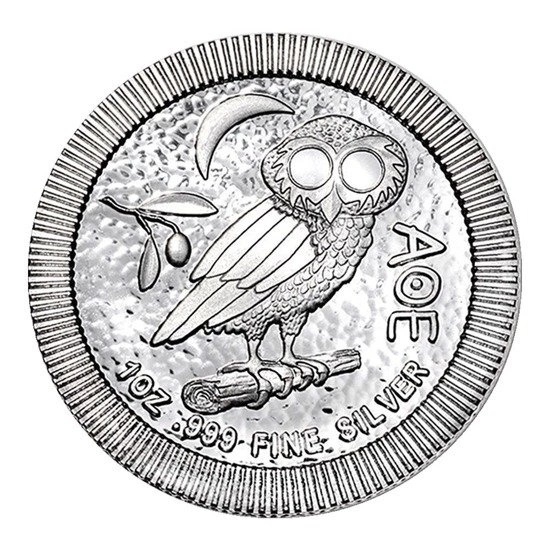 Representa un búho ateniense sentado en la rama de un árbol. En el fondo, la rama de olivo de la paz y la hoz de la Luna. Los grandes ojos brillantes del búho representan la capacidad de ver en la oscuridad y la sabiduría.