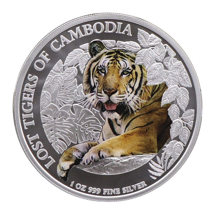 En el rostro de la moneda de plata figura un tigre de colores y la inscripción "LOST TIGERS OF CAMBODIA" (TIGRES PERDIDOS DE CAMBOYA), así como el peso y la prueba del lingote.