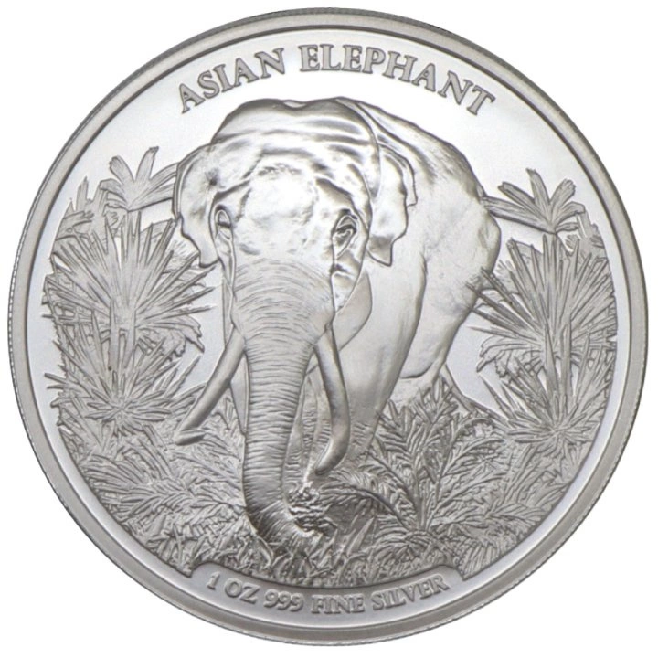 En el reverso de la moneda de plata figura un elefante asiático y la inscripción "ASIAN ELEPHANT", así como el peso y la prueba del lingote.