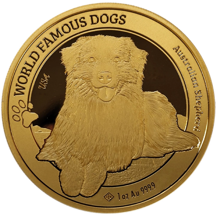 Camerún: Perros Famosos en el Mundo - Pastor Australiano 1 oz Oro 2024 es una moneda que se ha fabricado con oro puro Au.9999, pesa una onza troy y mide 38,6 mm de diámetro. El fabricante alemán de metales preciosos Leipziger Edelmetallverarbeitung es el responsable de su producción. La moneda de oro de 2024 se acuñó en una edición limitada de 1.000 piezas. Además, es una moneda de curso legal y está garantizada por el gobierno de la República de Camerún.