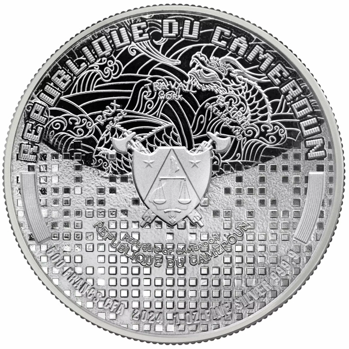Anverso presenta motivos característicos del silkpunk junto con el escudo de armas de Camerún, con información sobre el valor nominal, el año de acuñación, la pureza del metal y el país emisor.