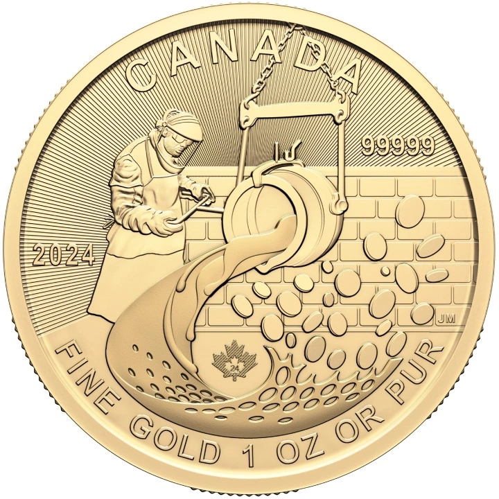 El reverso representa el proceso de refinado del oro, mostrando el oro líquido formando una placa de metal, que luego se corta en discos de ceca de oro puro. El reverso también muestra la prueba y el peso con el que se acuñó la moneda, así como el país de emisión. La Fábrica de la Moneda ha protegido aún más las monedas añadiendo una hoja de arce en miniatura con una marca micrograbada - «24»- en la parte inferior izquierda de la moneda, que indica el año de acuñación.