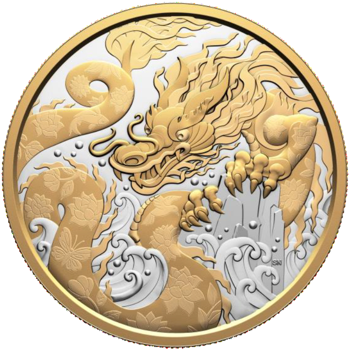 Canadá: Water Dragon $50 Gold-plated Silver 2025 Proof, que representa un dragón - el Panlong. Se trata de un lóng ('dragón') feliz y enroscado de la mitología china que tiene el poder de invocar la lluvia y controlar el clima. Vive en las aguas que fluyen por montañas, campos e incluso costas.