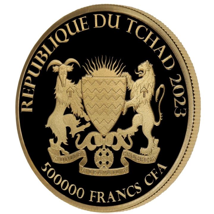 El Anverso de la moneda de oro muestra el escudo de armas de Chad, la inscripción "RÉPUBLIQUE DU TCHAD" e información sobre el año de emisión y el valor facial de la moneda.