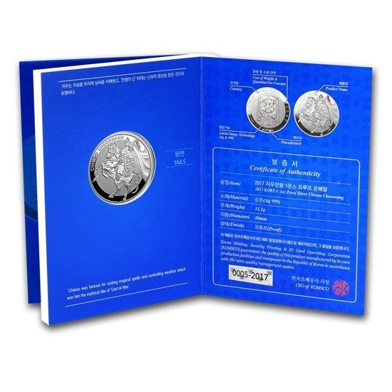 La medalla de plata producida en Corea del Sur por KOMSCO contiene un 99,9% de plata y pesa 1 onza. La moneda es la tercera edición de la popular serie de medallas Chiwoo Cheonwang entre los coleccionistas.