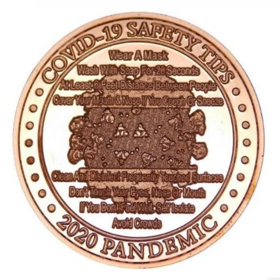 El anverso de la moneda muestra ocho consejos de seguridad ante una pandemia y la inscripción "COVID-19 Safety Tips" y "2020 Pandemic".