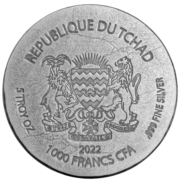 La moneda fue acuñada en plata pura Ag.999, pesa 5 onzas troy y mide 41 mm de diámetro, en estándar envejecido. La moneda de plata fue producida por la Fábrica de la Moneda de Scottsdale y está garantizada por el Gobierno de la República de Chad en cuanto a la pureza del lingote, la legalidad y el origen del metal. Además, la moneda tiene curso legal en el país emisor.
