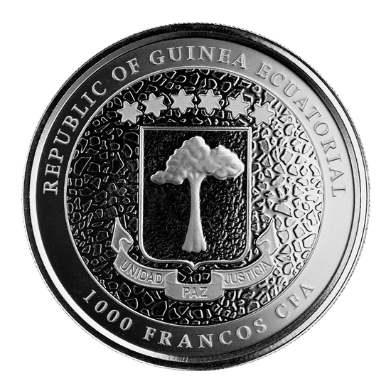 El Anverso de la moneda de plata muestra el escudo de armas de Guinea Ecuatorial. En el anverso también figura el valor facial de la moneda.