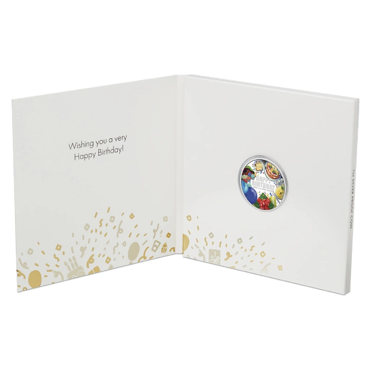 Los resaltadores muestran imágenes coloreadas de regalos, globos y pasteles, la inscripción "FELIZ CUMPLEAÑOS" e información sobre la pureza del lingote, el peso y el año de acuñación de la moneda. El diseñador fue Ing Jong.