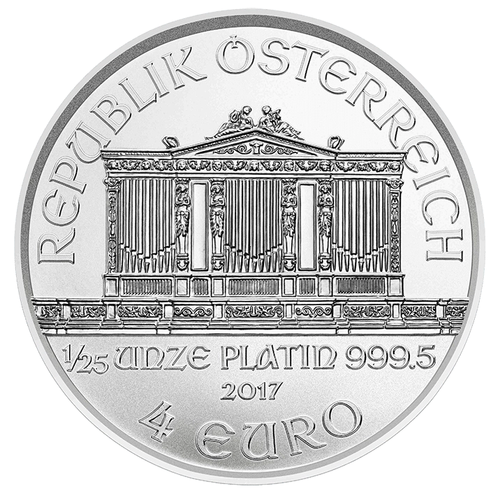 El anverso está decorado con el legendario órgano de la Orquesta Filarmónica de Viena. En él también se puede leer el valor, el peso, la prueba y el año de la moneda.