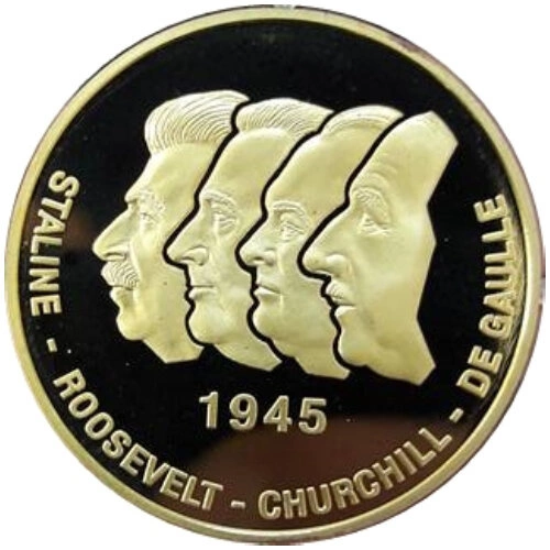 Reverso muestra los perfiles de cuatro líderes que jugaron un papel crucial en el fin de la Segunda Guerra Mundial: Joseph Stalin, Franklin Roosevelt, Winston Churchill y Charles de Gaulle. Abajo se encuentra la fecha "1945", con sus nombres escritos en francés: "STALINE- ROOSEVELT- CHURCHILL- DE GAULLE."