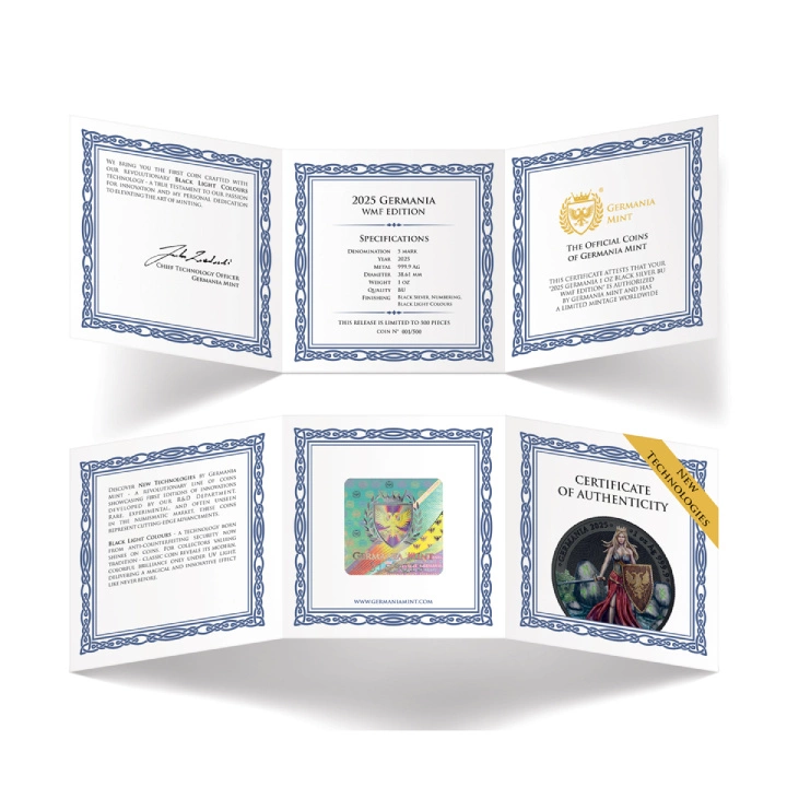 La moneda de plata está acuñada en Ag.9999 puro, con un peso de 1 onza troy y un diámetro de 38,61 mm. La tirada de la moneda está limitada a 500 piezas. Fue fabricada con la tecnología Black Light Colours, que genera un efecto fluorescente bajo luz ultravioleta. La moneda fue creada por Germania Mint y se entrega en su cápsula original con certificado de autenticidad.