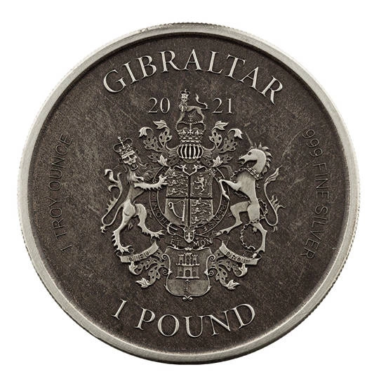 La moneda fue acuñada en plata de ley Ag.999 pura, pesa una onza troy y mide 39 mm de diámetro, en patrón antiguo. La moneda de plata fue producida por la Fábrica de la Moneda de Scottsdale, en una tirada reducida de 5.000 piezas. Tiene curso legal en el territorio de Gibraltar.