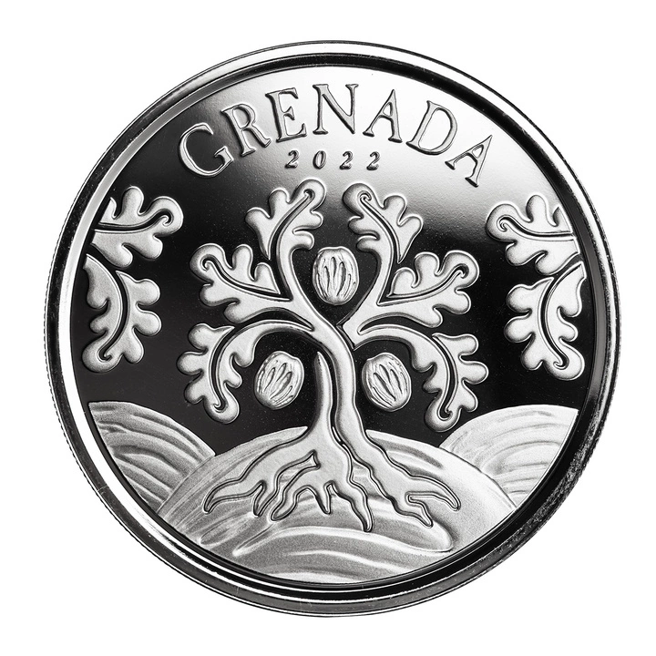 El reverso muestra una nuez moscada junto con una nuez moscada cayendo. En el reverso también figura la inscripción "GREENADA 2022". .