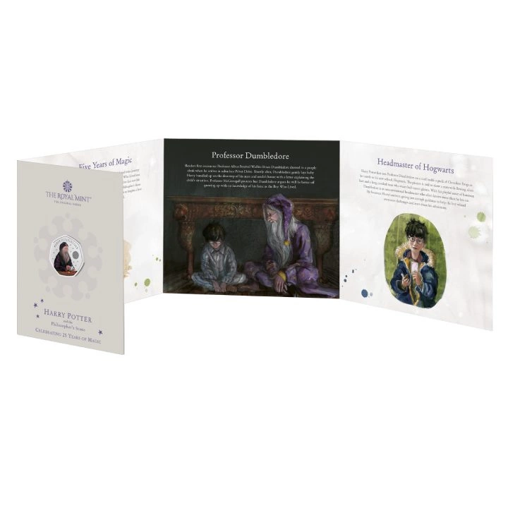 Los anversos de la moneda muestran a Albus Dumbledore y las inscripciones "ALBUS DUMBLEDORE", "25 AÑOS DE MAGIA". Ffion Gwillim es la responsable del diseño del reverso.