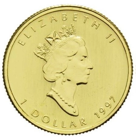 En el reverso de la moneda figura la hoja de arce, símbolo nacional de Canadá, así como la acuñación y el nombre del país en el que se fabrica la moneda.