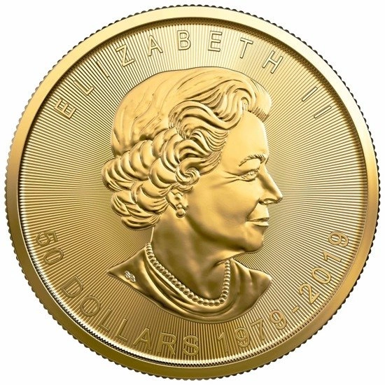 La moneda del jubileo difiere fundamentalmente del diseño clásico de la hoja de arce. En el anverso aparece el perfil, perfectamente reconocible, de la reina Isabel II, la denominación de la moneda (50 $) y las fechas que definen los cuarenta años de acuñación de la moneda de oro de la hoja de arce (de 1979 a 2019). El reverso es, a su vez, una hoja de arce extremadamente llamativa sobre un gran número 40. El reverso también contiene información sobre la prueba de la moneda (Au 9999) y el país de origen.