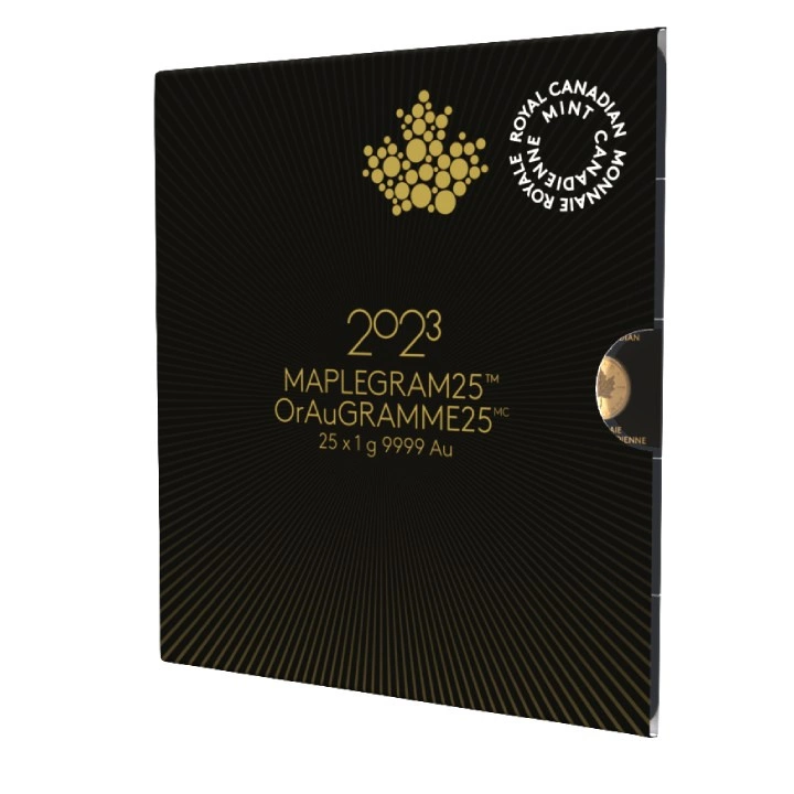 Cada moneda está preenvasada y ocupa una de las veinticinco cajas del embalaje para coleccionistas: el Maplegram 25™. Además, cada moneda de oro, junto con su embalaje protector, puede separarse del resto o guardarse entera de fábrica.