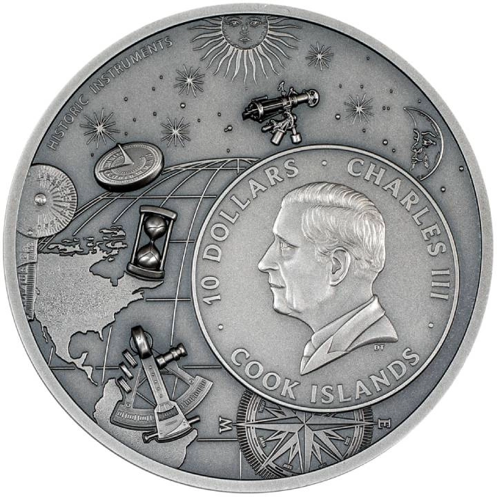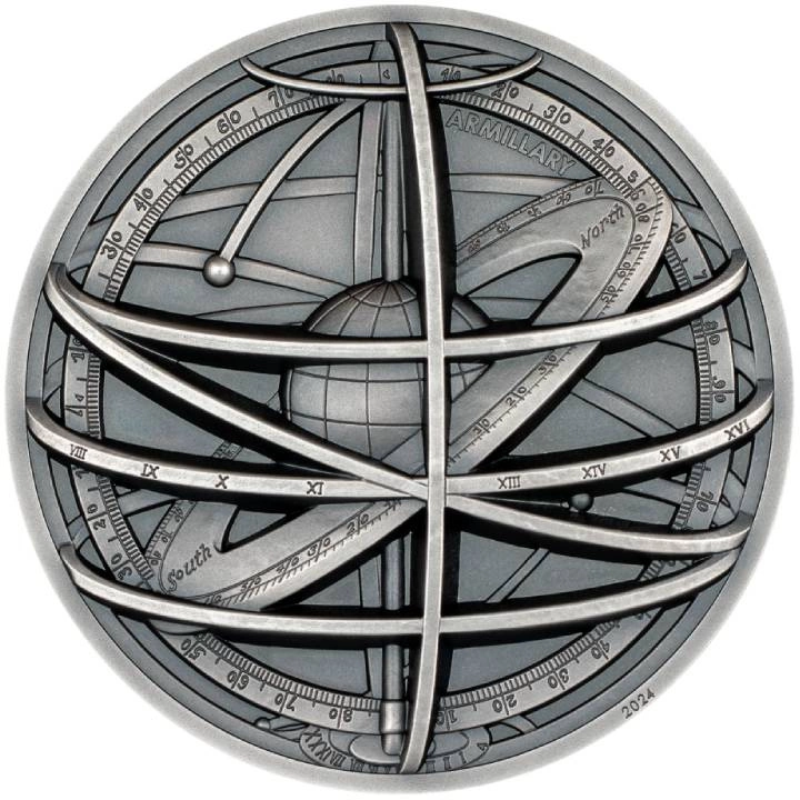 Islas Cook: Instrumentos Históricos - Esfera armilar 2 oz Plata 2024 Ultra High Relief Antiqued Coin