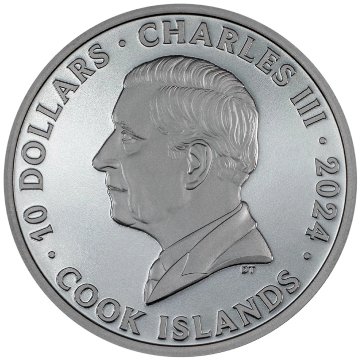 La moneda de plata fue acuñada en plata pura Ag.999, con un peso de 2 onzas troy, 38,61 mm de diámetro, en negro proof y alto relieve. La acuñación de la moneda es de 999 piezas. Tiene curso legal en las Islas Cook.