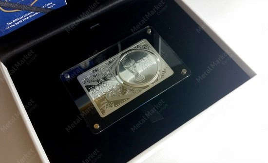 El reverso del set representa la hermosa copa del campeonato, con la inscripción al lado: "чемпионат мира по футболу фифа 2018 В россии". - Copa Mundial de la FIFA 2018. En la parte inferior del reverso del juego hay un número individual y en la esquina superior derecha información sobre el peso del lingote y la muestra de plata "2 OZ AG .999". En el anverso cuelga la inscripción "COPA MUNDIAL DE LA FIFA RUSIA 2018". En el anverso de la moneda aparece el escudo de Rusia y las inscripciones: "3 PУБЛЯ". - denominación (tres rublos), "БАНК РОССИИ" - país de emisión (Banco de Rusia), "2018" - año de emisión , "Ag 999" - muestra de plata y "31.1" - peso de la moneda.