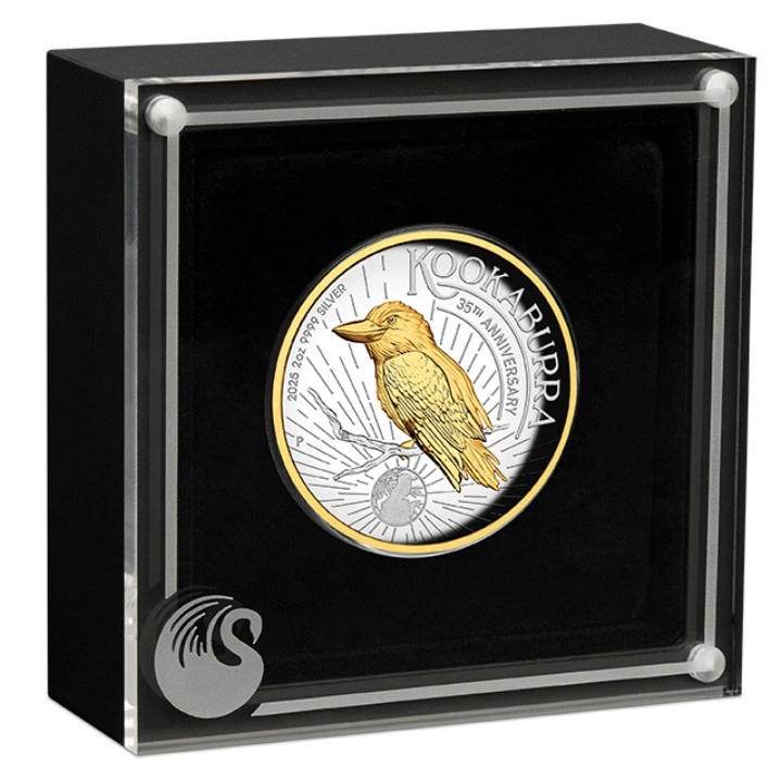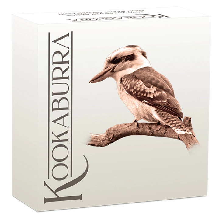 Con motivo del 35.º aniversario de la icónica serie Australian Kookaburra, la Casa de Moneda de Perth presenta otra moneda excepcional con la imagen del kookaburra, una de las aves más reconocidas de Australia. La moneda ha sido acuñada en calidad High Relief y tanto el ave como el anillo exterior están recubiertos de oro de 24 quilates. Además, el reverso incluye un símbolo conmemorativo del diseño original de 1990 y líneas radiantes que simbolizan el amanecer.