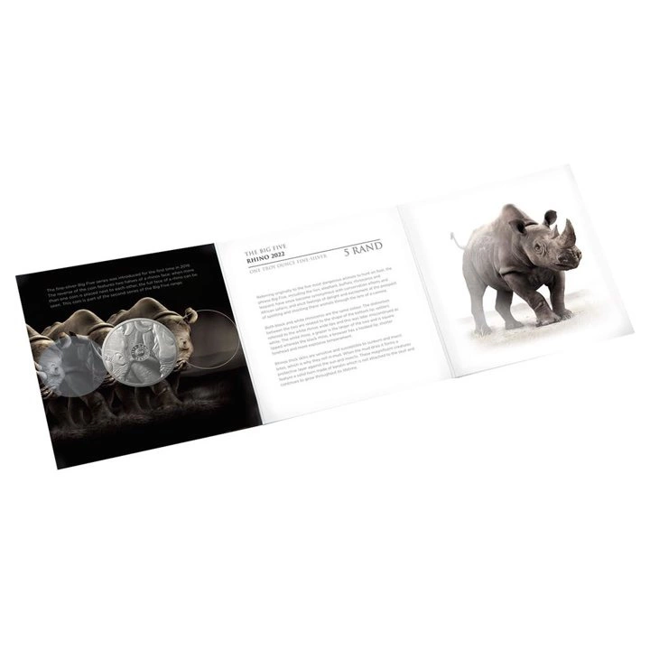 El anverso muestra la cabeza de un rinoceronte y la inscripción "SOUTH AFRICA", "BIG FIVE 2022" y el escudo sudafricano.
