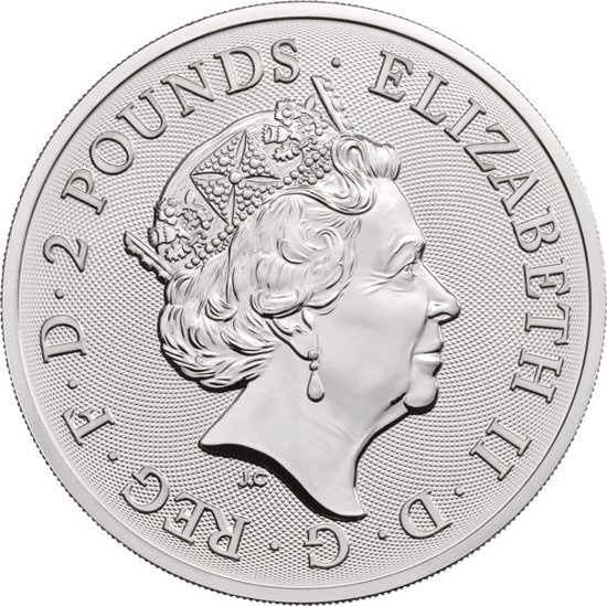 El anverso se modifica en cada año impar de emisión. Representa la imagen de la reina de Inglaterra, Isabel II, con una corona. También puede verse en el valor facial (£2).