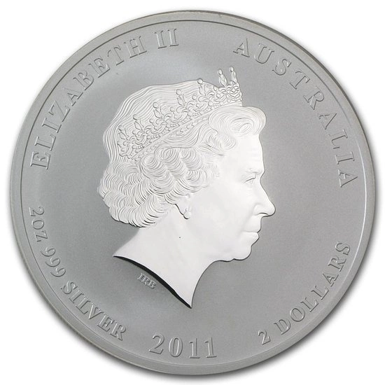 El anverso de la moneda de plata del Año del Conejo está decorado con la imagen de la reina Isabel II. El conjunto está rodeado por la inscripción "ELIZABETH II", "AUSTRALIA" e información sobre el valor facial, el peso y la acuñación.