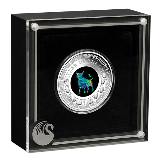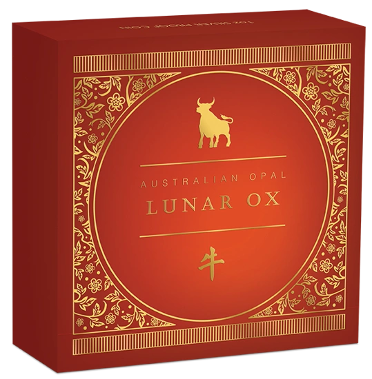 Recambios incluyen un retrato en ópalo de un búfalo. El diseño incluye el carácter chino "buffalo", la inscripción "OX 2021", la letra "P", que es la marca de ceca de The Perth Mint, e información sobre la prueba de lingotes, el peso y el año de acuñación. .
