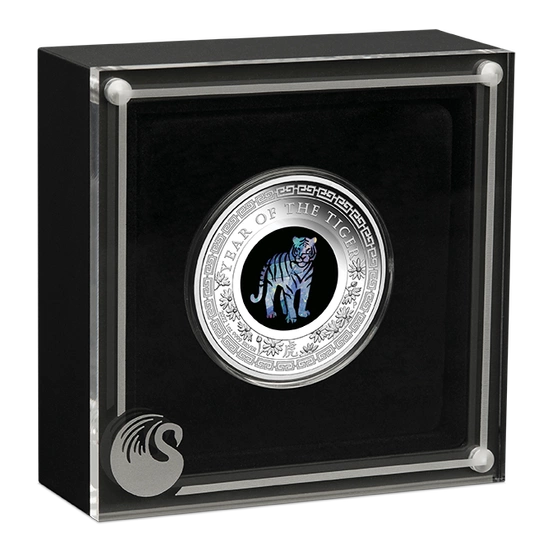 Recambios incluyen una imagen en ópalo de un tigre. En el diseño aparece la inscripción "YEAR OF THE TIGER" (AÑO DEL TIGRE) y la letra "P", la marca de ceca de The Perth Mint, así como información sobre la prueba de lingotes, el peso y el año de acuñación. .